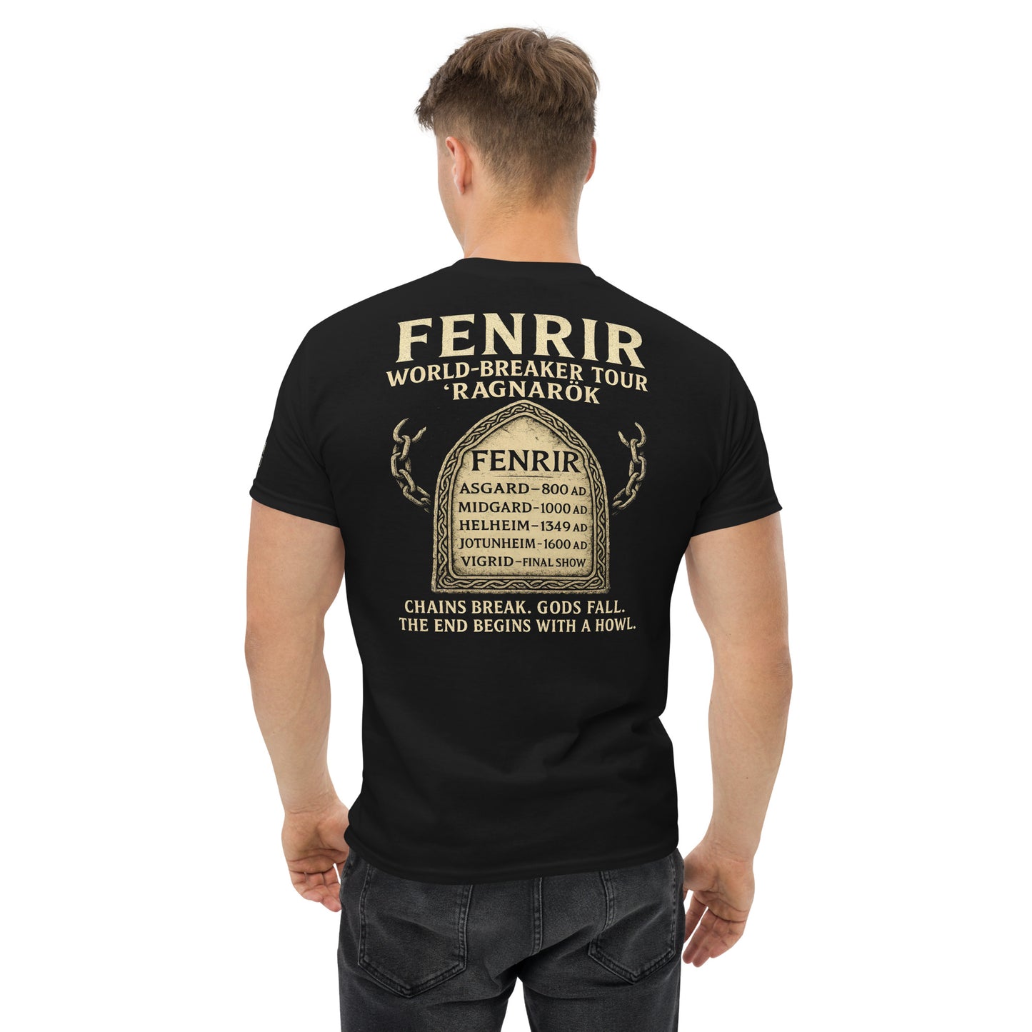Unleash the beast with this bold Fenrir T-shirt, styled like a classic band tee featuring “world tour” dates on the back—the legendary days when Fenrir breaks free. Perfect for fans of Norse lore, heavy metal vibes, and striking graphic tees, this shirt blends fierce mythology with iconic rock style. Stand out with a design that roars power and unstoppable force.
