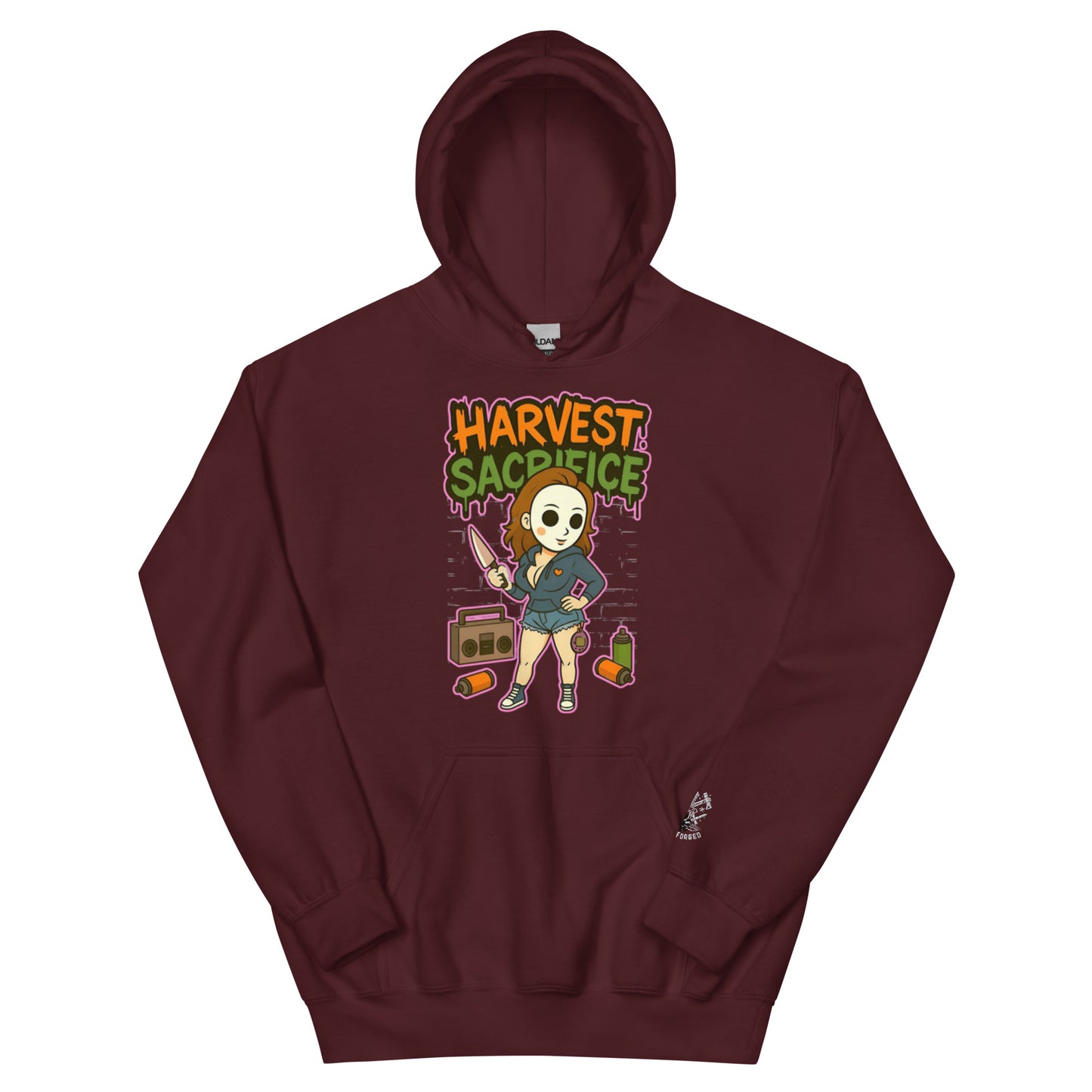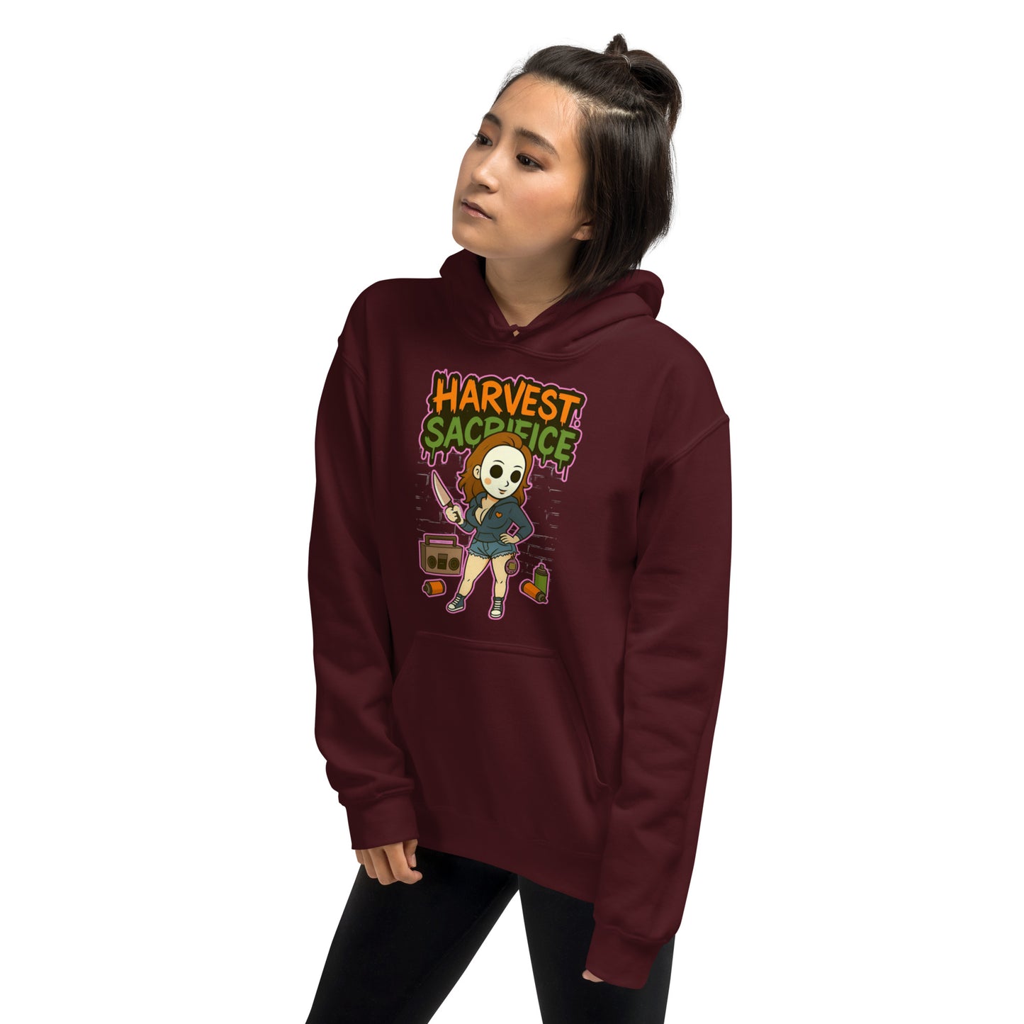 Cozy meets killer cute. The Harvest Sacrifice hoodie takes chibi street art vibes and turns them into your new go-to statement piece. With bold 90s graffiti lettering and a flirty masked pin-up front and center, this hoodie was made for nights out, lazy mornings, or stealing the show at Halloween parties. It’s soft, oversized-ready, and dripping with the kind of attitude that makes people ask, “Where’d you get that?” Pair it with leggings, shorts, or your favorite boots for an effortlessly edgy look.