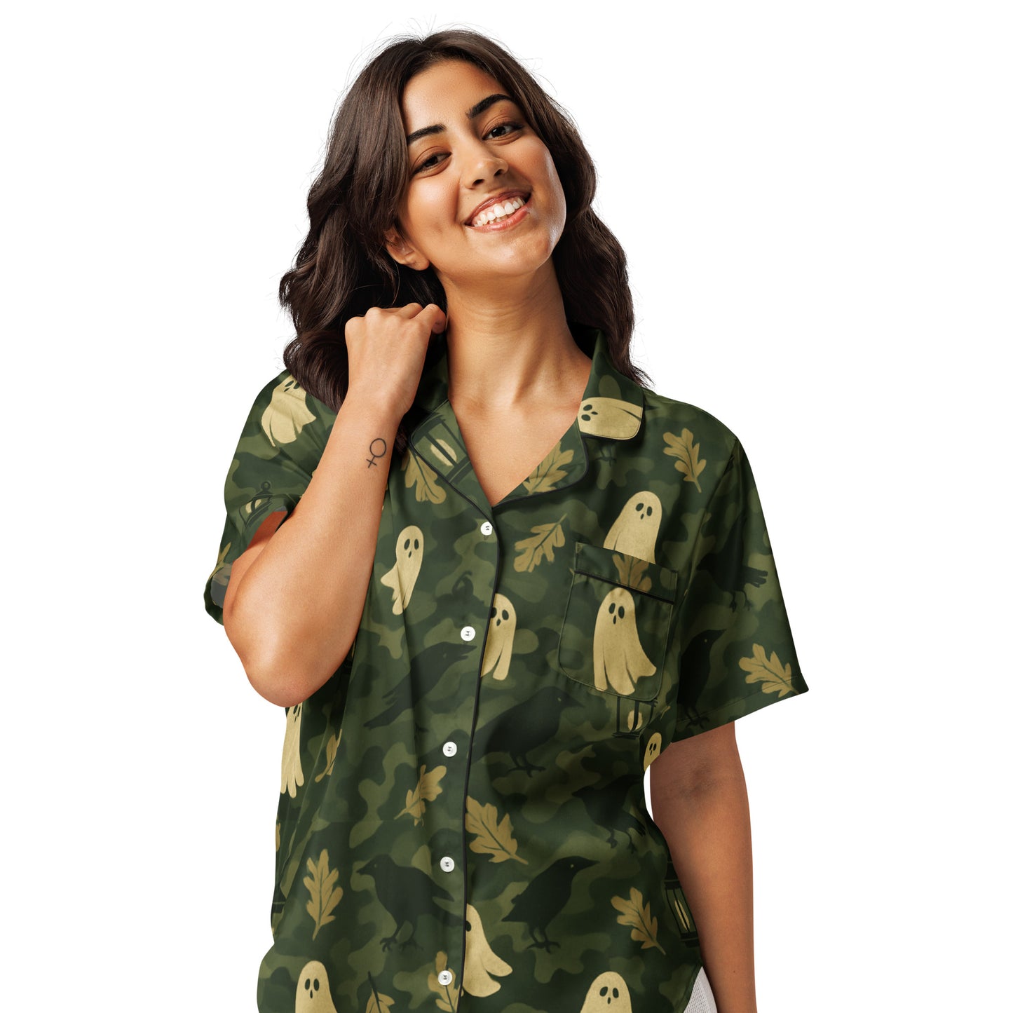 Step into cozy mystery with the Hauntwood Women’s Night Outfit. This unique sleepwear combines classic green camouflage with hidden ghosts, ravens, and glowing lanterns for a subtly spooky, stylish look. Perfect for lounging at home or embracing the autumn night, Hauntwood nightwear offers comfort, flair, and a touch of haunting elegance. Ideal for ghost lovers, autumn vibes, or anyone who wants sleepwear with personality.