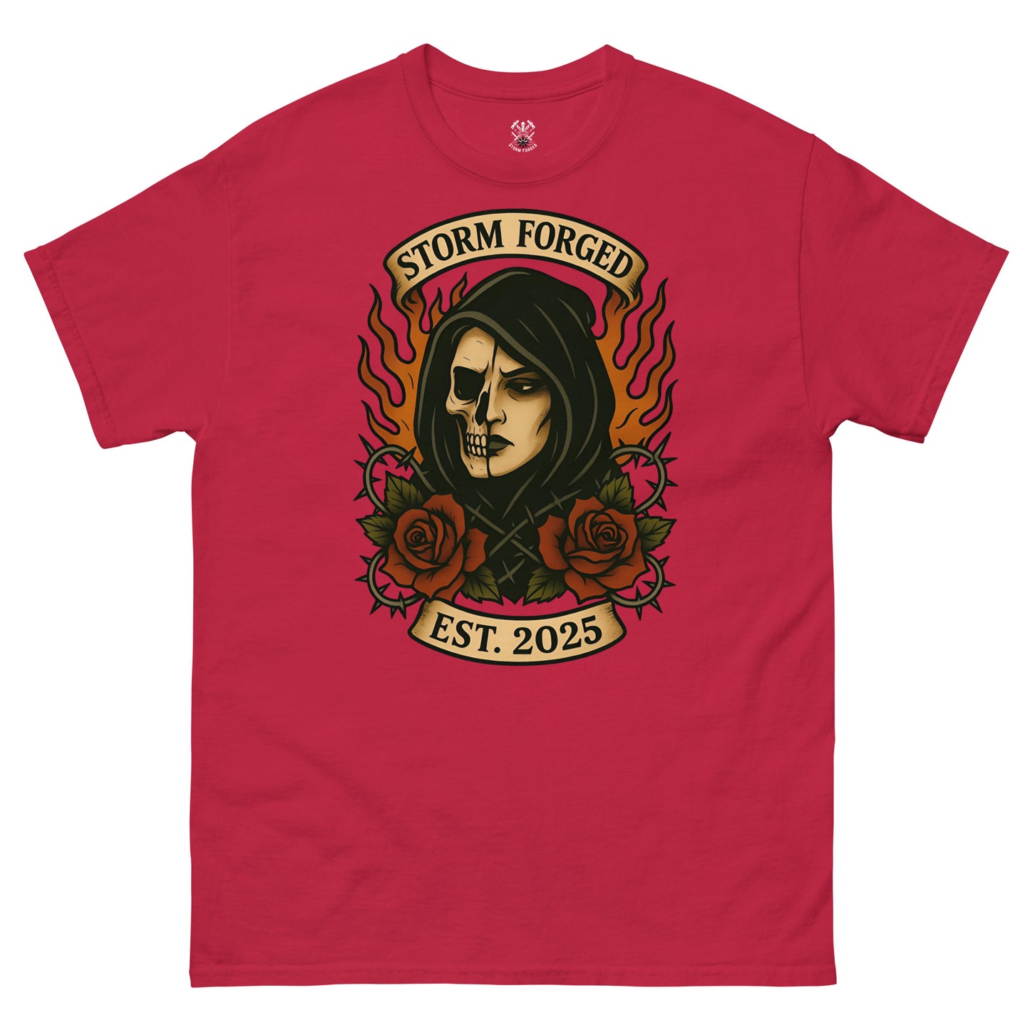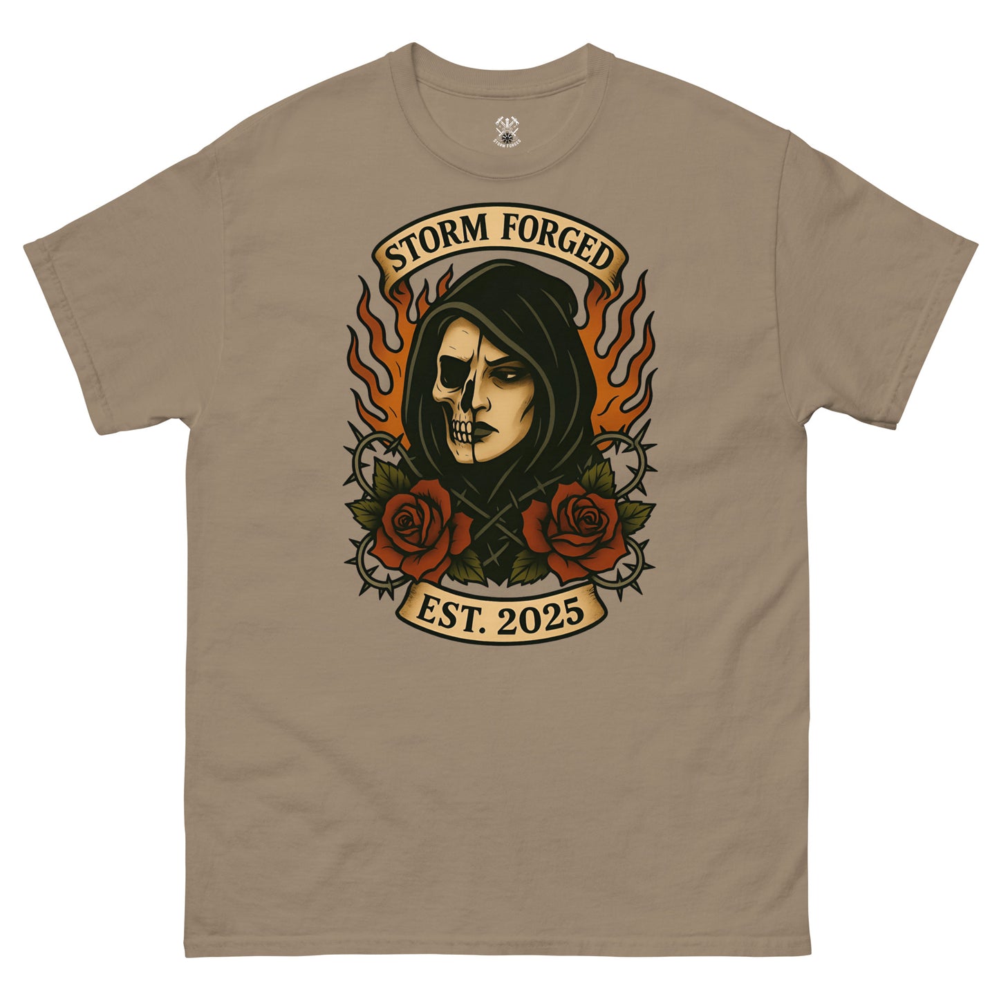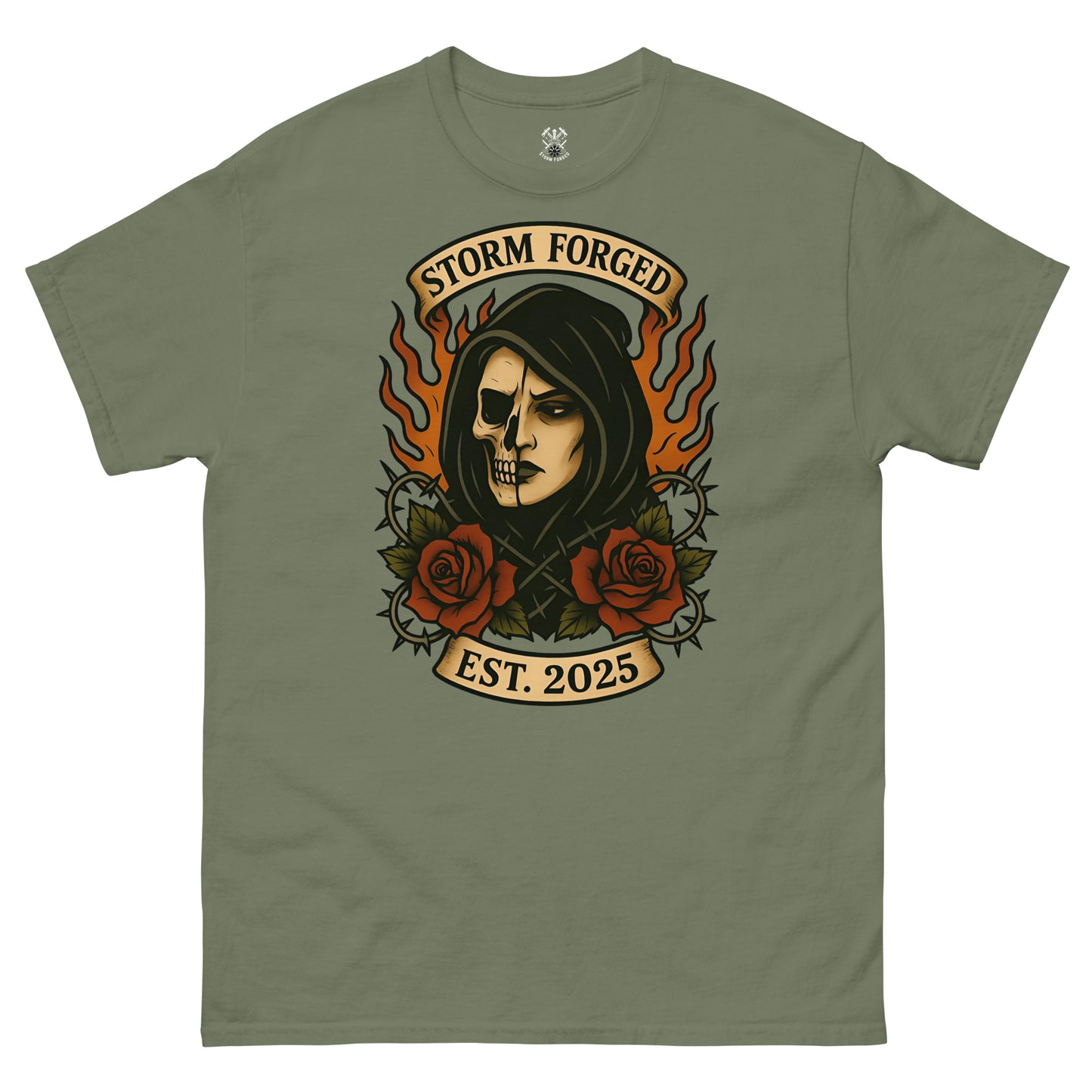 Face the darkness with Hel’s Gaze — a bold men’s t-shirt featuring the death goddess in a split-face design, half skull and half haunting blue-eyed woman. Surrounded by roses, barbed wire, and flames, this Storm Forged original blends Norse culture with tattoo-style grit. Perfect for men who embrace power, shadow, and strength without fear.