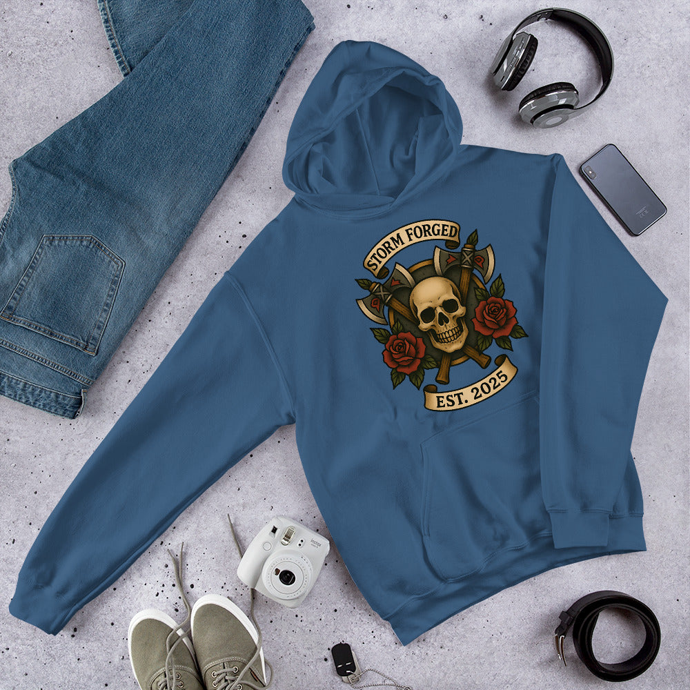 Unleash raw Viking power with this bold Storm Forged design. Featuring a menacing skull over a round Norse shield with crossed axes and roses, this traditional tattoo-inspired artwork blends dark warrior energy with classic flash art. Perfect for those who live forged in fire, strength, and brotherhood. Banner details read Storm Forged and EST. 2025, making it a timeless emblem for apparel or gear.