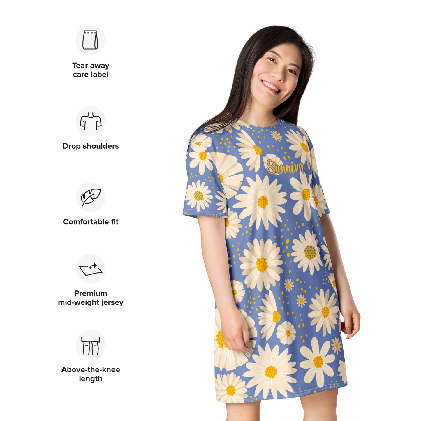 Embrace light and positivity with the Sunniva nightgown, featuring delicate white and yellow sunflowers on a soft blue-purple fabric. Perfect for cozy nights, dreamy mornings, or as a thoughtful gift for anyone who loves floral-inspired, uplifting sleepwear.