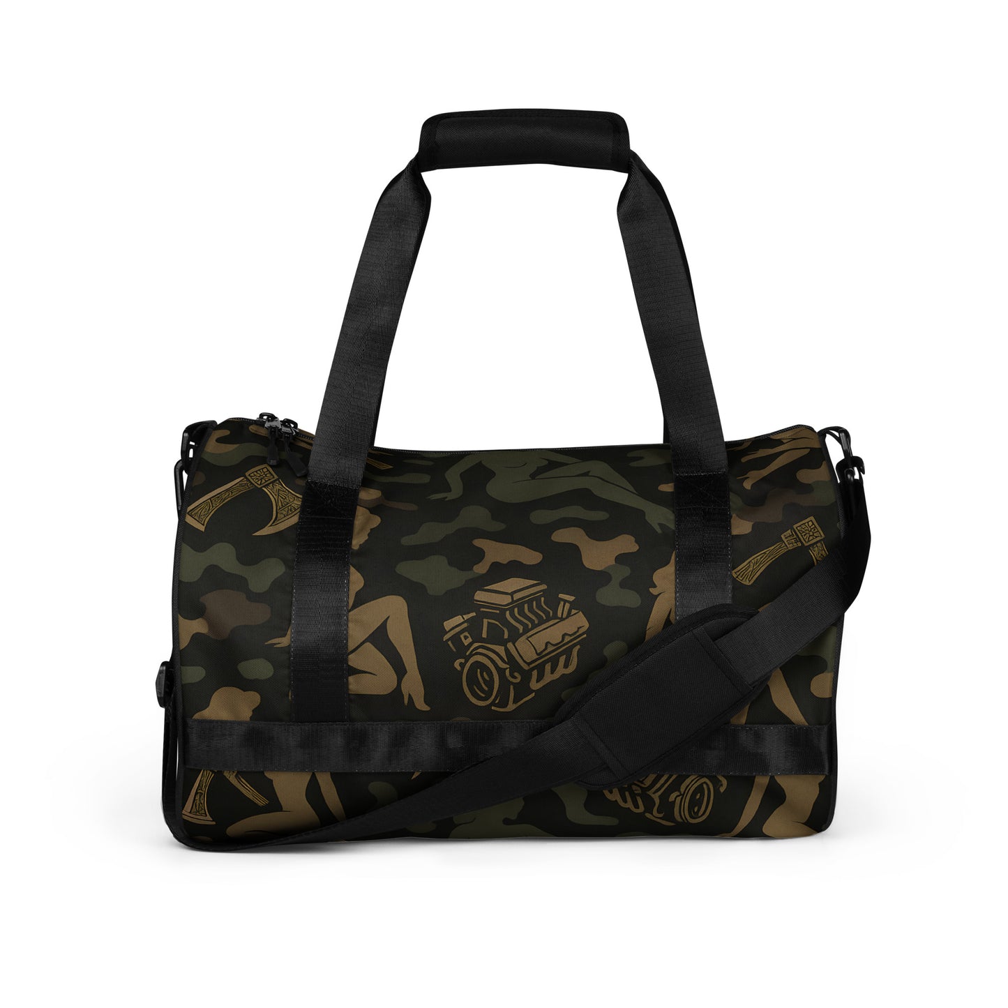 The Torque and Temptation Camo Duffel isn't your average gear bag — it's a battle cry in fabric. Featuring a custom camo pattern woven with V8 motors, seductive silhouettes, and crossed axes, this duffel is built for men who live fast, train hard, and don't apologize for the fuel that drives them. Whether you're headed to the gym, the garage, or a weekend escape, this bag packs raw power and rebellious style. Durable, spacious, and undeniably bold — carry it like you mean it.