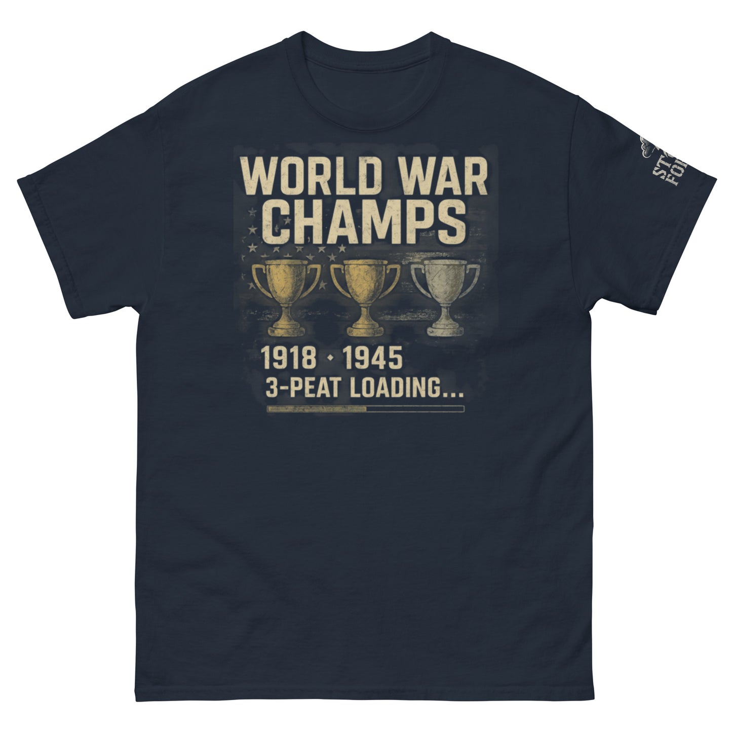 Celebrate American grit and unmatched victory with our "World War Champs" tee—boldly honoring the U.S. wins in World War I and II, and teasing the potential for a legendary three-peat. Featuring distressed trophy icons for 1918 and 1945, a grayscale third trophy symbolizing the next chapter, and a gritty stars-and-stripes background, this shirt makes a statement that’s loud, proud, and unapologetically patriotic. Designed in a military stencil font, it’s perfect for veterans, patriots, history buffs, and freedom-loving Americans who don’t back down.